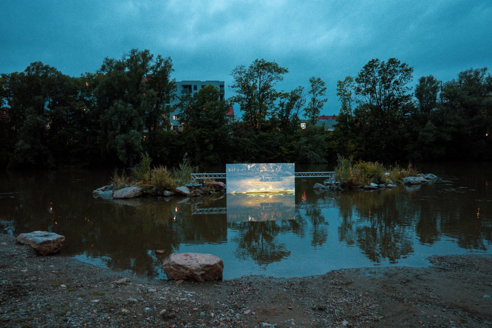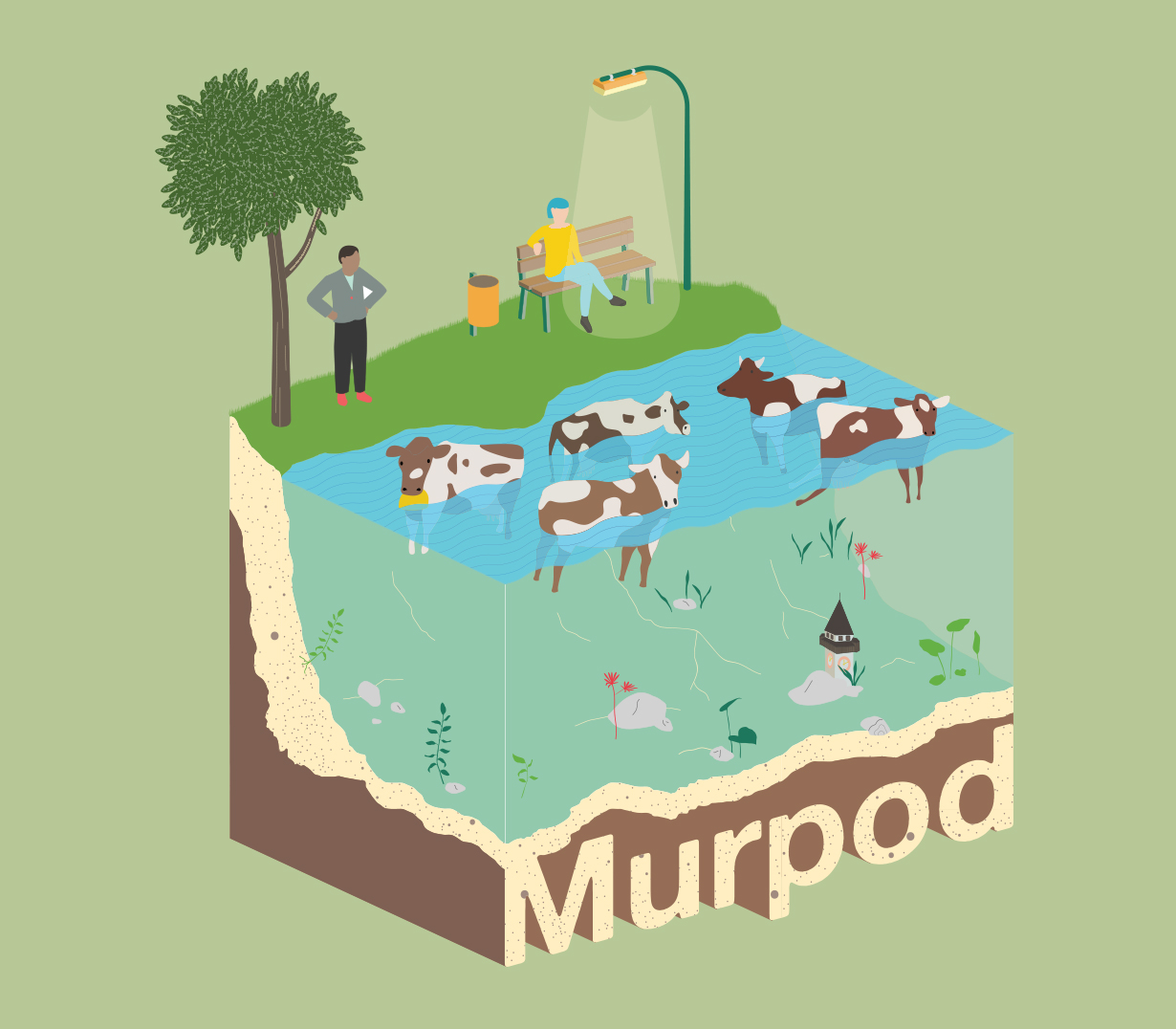 A herd of cows swims in the waters of the Mur. Washed away from their alpine pastures, they pass the riverbanks of Graz, floating in the stream as buoys of industrialized livestock. The ringing of their bells brings a rural atmosphere to the city center. Climate change confuses the structures of city and countryside - it rearranges spatial orders. Project "Murpod" is a temporary installation in the Mur river in Graz as part of the Graz Kulturjahr 2020 and was filmed in the game Red Dead Redemption 2.