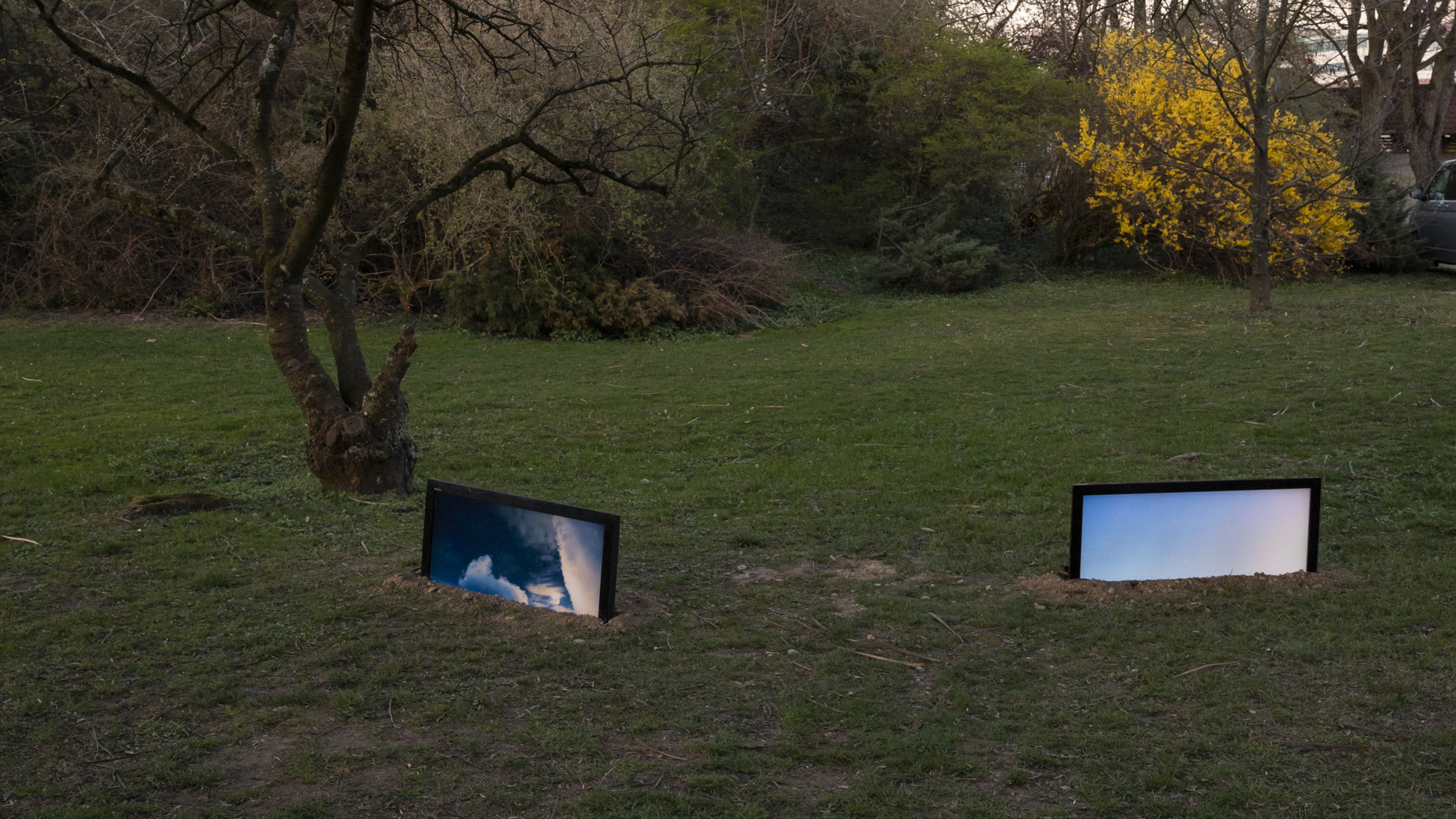In Morgenerst Abendletzt is a series of partially buried digital screens that display the journey of celestial bodies – sun, moon and stars – in their paths across the sky from sunrise to sunset. In addition to that, a series of descriptions of people moving through landscapes can be heard. However, these images are not real, but digital renderings taken from the worlds of computer games. Likewise, the travelers are not wandering through physically real spaces, but through virtual territories that they encounter in these games. In the installation, the digital horizon is the line where the physical world merges with the simulation, marking the meeting point of the digital sky and the soil enclosing the screen.